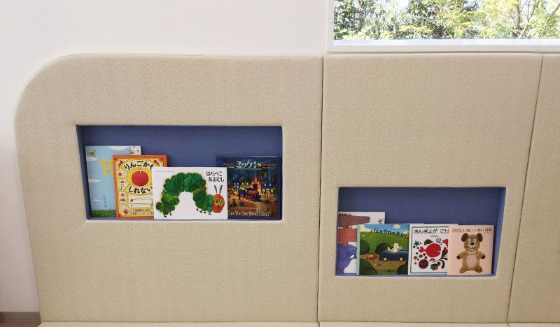 左側にはウレタンマットの一部を開口し、絵本をディスプレイするように収納できる絵本棚を設え、どの年齢のお子さまでも取り出しやすい様、高さに違いをつけています。