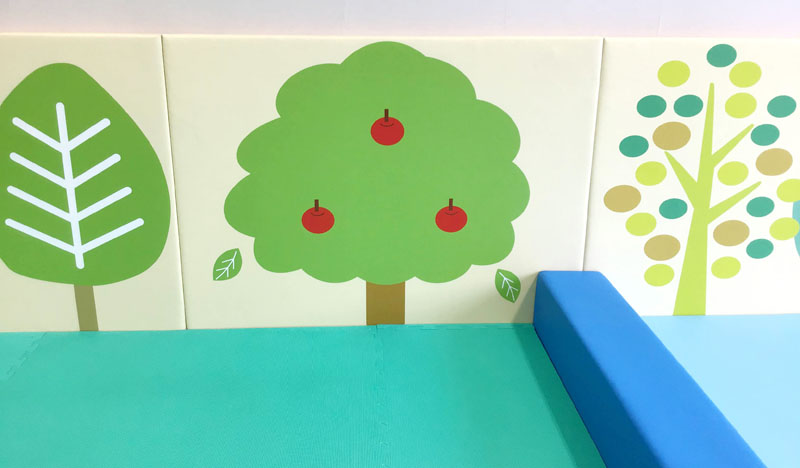 壁面には印刷生地を採用し、ジョイントマットの上にキッズ用テーブル、スツールセットの