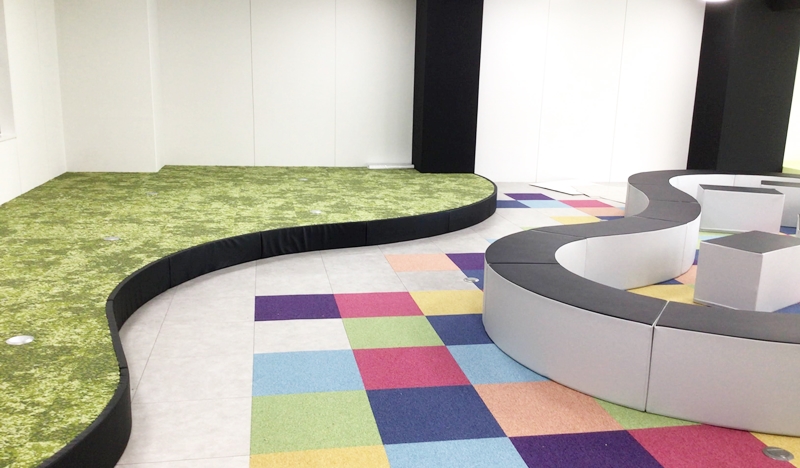 芝生を連想させるゆったりした空間ステージや、段差を付けてデスク代わりにもスツール代わりにもなるひな壇、そして