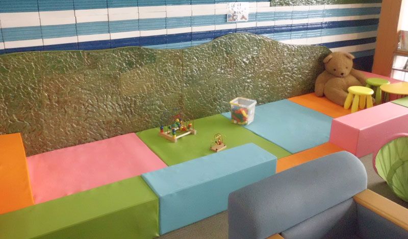 海をイメージしたデザインの壁面に合うキッズコーナーが作りたいとご依頼をいただき、いくつかご提案を差し上げた中でお写真のようなとても人気のある配色をご採用いただきました。